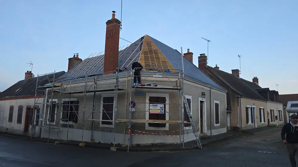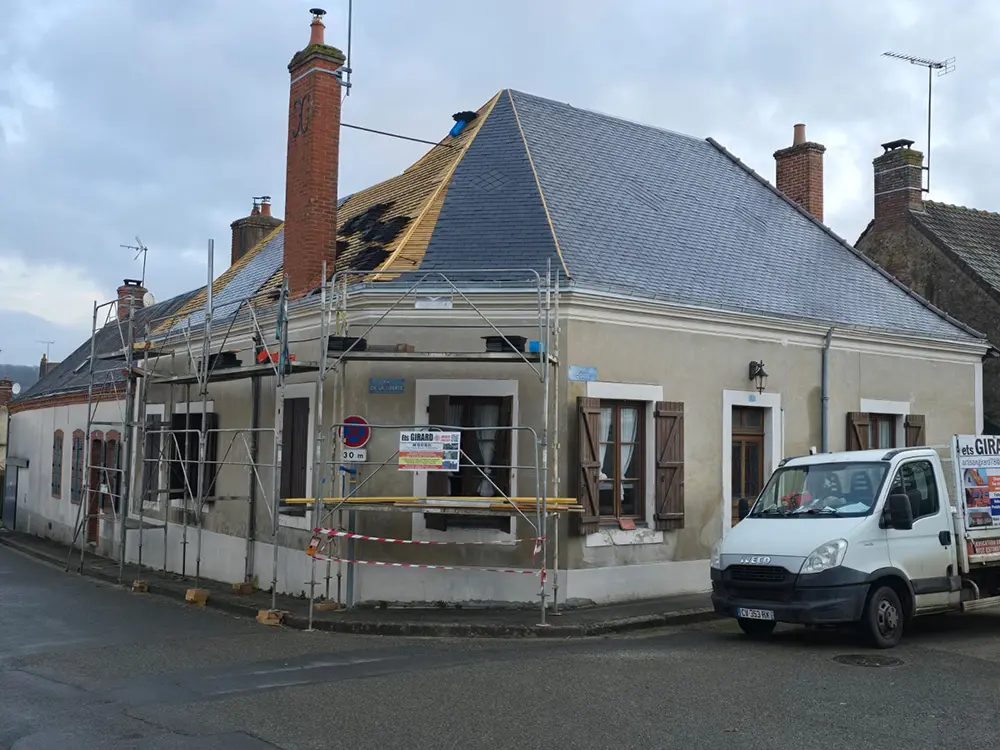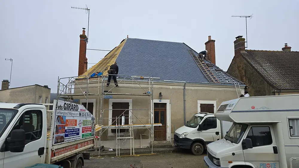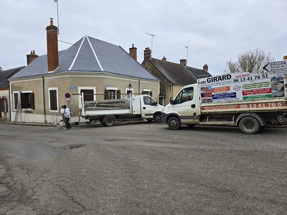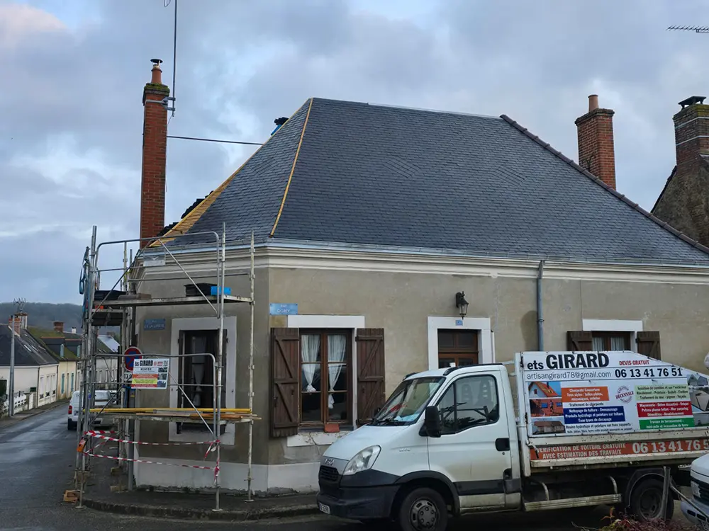 L’entreprise Girard est intervenue à Saint-Michel-de-Chavaignes (72440) pour la rénovation complète d’une couverture en ardoise avec gouttière, faîtage et arêtier en zinc, ainsi que des éléments en terre cuite. Cette rénovation assure à la fois l’étanchéité et la durabilité du toit.
